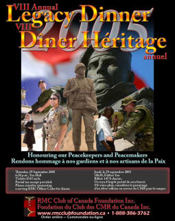 We get e-mails . . . Bill, I have just read the August 2005 e-veritas. Well done again! I printed the whole thing out this time - all 24 pages of it. Both Joan and I read it with great interest. It was full of all sorts of interesting College/Club related items. It can be a great recruiting device for the Club and Foundation. One direct result of this e-veritas is that Joan and I are now signed up for the Legacy dinner in September. On the Nijmegen Marches article there were a couple of points on which I would like to comment. The first is that I don't think that this is the first time that RMC has entered a team in the Marches. I think that that honour goes to the 1994 and 1995 Marches when #8684 LCol (now BGen(Retd)) Peter Holt lead the RMC teams when he was the College's Administrative Officer. He subsequently became the long time Nijmegen Team Commander. But his action in having RMC send a team in those two years kept the CF's participation in the Marches alive during those tough years of transition after the closure of CFE and for that, inter alia, he was inducted into the CF Sports Hall of Fame. General Romses name (misspelled once) is a also a War Studies Graduate of RMC and, more importantly, like General Fenton has a college number. I suggest that it is important to include the numbers of folks like this. It is a way of making them feel more at home in the Club and hence more willing to become Club members. See you and Rolande at the Legacy Dinner and Reunion Weekend. 3550 Murray C Johnston (Colonel ret’d)