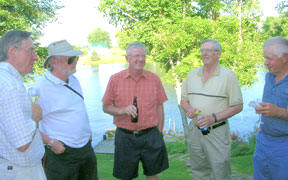 Following the RMC Club Ottawa Branch Golf Tourney at the Hylands Golf Club on July 15th, the class of ‘63 held a BBQ at Frank & Marg McDonnell's place in Ottawa, along the Rideau River. First the RMC golf day was sold out & very popular (144 golfers shotgun start at 8:00 am). Players from the Class of '63 included Tory Payne, Trayten Jensen ,Darwin Marquardt, Frank Jewsbury, Doug Sinclair & Frank McDonnell, a good representation. The Class of '63 BBQ also featured a great turnout, perfect weather, lots of laughs, good food & a few refreshments etc. Attendees at class BBQ were Doug Sinclair & Kelda, Barry Winfield & Claire, Frank Jewsbury & Lorette, Ken Drolet & Estelle, Don Poole & Jan,Trayten Jensen,Tory Payne & Mary,Darwin Marquardt, Frank McDonnell & Marg, Fred Carpenter & Ann,Bill Bawden & Fran, Mary Partington, Art Hunter & Maggie, John Thomas, Nigel Van Loan, Gord Caffrey. Rumour has it that Frank & Marg are planning to host the 2nd annual BBQ again next year following the golf. |