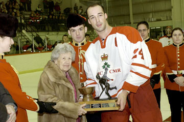 For the first time since 2001, RMC has won the Carr / Harris Cup. Paladins beat Queen’s Golden Gaels 5 -3 (empty net goal) to capture the coveted Cup. This was the 19th anniversary of this highly competitive cross-town rivalry. RMC won for the 7th time; Queens have skated away with victories 11 times and there has been one tie. Three goals in the third period brought RMC back from a 3-2 deficit to triumph. Encouraged by the RMC Band and a standing room only (SRO) at Constantine, the Paladins proved to be the stronger team on this day. 23239 OCdt Jamie Routledge provided a dominant physical dimension to the game and was selected as RMC's MVP. RMC had fallen behind 3 – 0 before they took over control of the game at the midway point of the second period. Louis Charland and Tyler Middlebrook were both standouts and deserve Honourable mention for their offensive play in the game. The same two teams battled the very next day at Jock Hardy Arena. The final result was 3 to 2 for the Golden Gaels. With the win Queens, kept the race close in the OUA East Division for the final play-off spot. RMC currently has 15 pts to 12 pts for the Gaels, as both teams head to the home stretch.